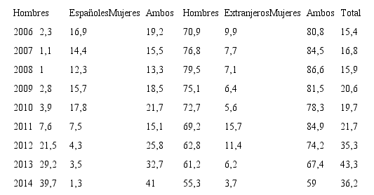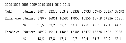 El análisis de los contratos registrados en agricultura es útil para entender esta condición. Entre 2006 y 2013, se observa un descenso en el peso de los contratos a trabajadores inmigrantes sobre el total (del 51,5 al 44,6 por ciento), que responde no tanto al descenso de contratos en este colectivo (1.136 menos) como al incremento en 3.979 de los contratos a españoles (del 48,5 al 55,4 por ciento) (tabla 9).