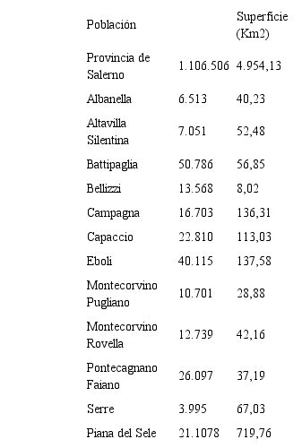 La Piana del Sele es un área de producción agrícola en la provincia de Salerno, que se ha caracterizado, desde principios de los años 80 del pasado siglo, por un pro- fundo cambio con importantes efectos en los procesos de producción agrícola. El área de Salerno comprende 1 municipios, con una superficie total de 719,76 km2 (tabla 1).