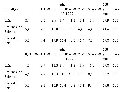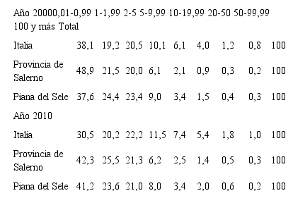 Específicamente, la difusión de la producción de hortalizas de cuarta gama ha significado un salto “evolutivo” para una parte de las explotaciones locales, que han cambiado su organización productiva para insertarse en un sistema totalmente indus- trializado, del campo al supermercado. Excepto en algunos casos, este salto evolutivo no se ha unido a un salto dimensional: las explotaciones y las empresas agrícolas se han mantenido en pequeñas dimensiones, aunque en la década 2000-2010 las empre- sas con menos de 10 hectáreas hayan reducido el porcentaje de superficie utilizada total de un 51,4% a un 45,6% del total (tablas 4 y 5).