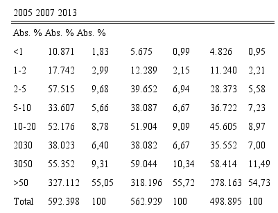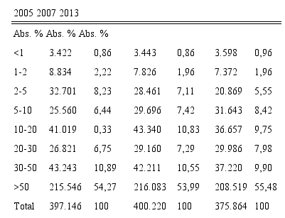 Otro aspecto históricamente importante para comprender este enclave produc- tivo agrícola es la propiedad de la tierra. Desde principios del siglo XX la propiedad de la tierra ejerció de “capa de plomo” (Pedreño, 1998) para el desarrollo industrial local, que deviene en débil. La tabla 7 muestra la evolución de la superficie agrícola y su dis- tribución según el tamaño de la plantación.