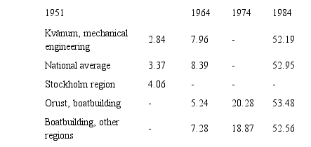 Trade unions can be identified as a key factor in this process. In Kvänum, workers were already organised in the late 1930s at the larger firms. In Orust, the union breakthrough did not come until the transition from wood to fibreglass after 1964. It is possible that a growing competition between firms over labour contributed to the upward trend in salaries within the studied communities. But the levelling of wages must above all be attributed to the “solidarity wage policy”. The small wage differences in 1984, both between regions and sectors, illustrate its profound effect on the Swedish labour market.