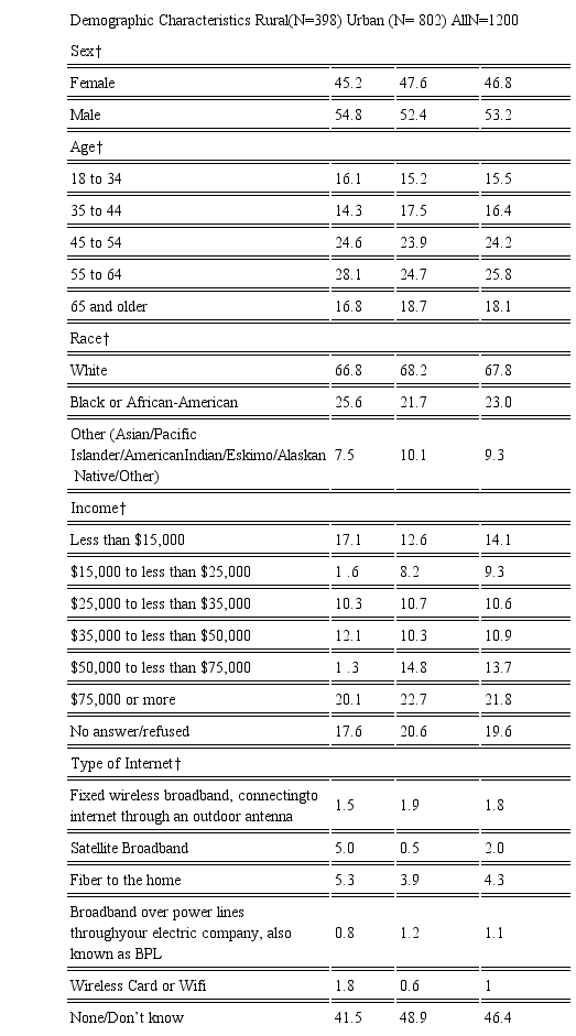Rural respondents differed from their urban counterparts in numerous ways. Rural respondents reported lower socioeconomic status than urban respondents, as reported by income. Table two provides detailed sample characteristics of rural, urban and all survey respondents in the state. Rural respondents reported lower incomes than urban respondents, with 62.4 per cent of rural respondents reporting an annual income of less than $75K compared to 56.6 per cent of urban respondents (p<0.05). Rural respondents were older; 44.9 per cent of rural respondents were 55 or older, compared to 43.4 per cent of urban respondents (p<0.05). More males lived in rural areas than urban areas (54.8 versus 52.4 per cent, p<0.05). Representative of the demography of the South, this sample from South Carolina had more rural African- Americans than urban African-Americans (25.6 versus 21.7 per cent, p<0.05). A some- what surprising characteristic of this sample is that rural respondents were more likely than urban respondents to report some type of internet service (58.6 versus 51.2 per cent) and more likely to report a form of broadband (12.6 versus 7.5 per cent, p<0.05). These results should be treated with caution as many of the rural respondents indi-117cated satellite broadband as their provider, which depending upon speed and reliabil- ity, may not be a comparable service to other forms of broadband.