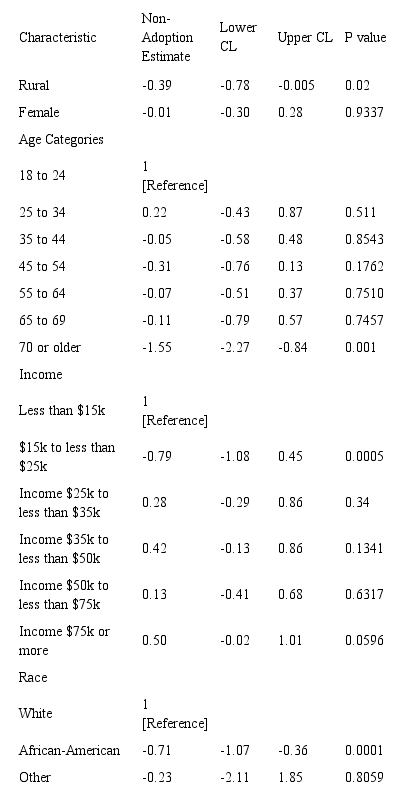 Multivariable analysis adjusting for gender, age, race, and income, residence is associated with non-adoption of broadband in South Carolina (table 3). As expected, living in a rural setting decreased the likelihood of broadband adoption with a point estimate of -0.39 [95% (-0.78, -0.005)]. This study found that individuals 70 years and older in South Carolina were less likely to use broadband, with a point estimate of -1.54 [95% (-2.27, -0.84)]. Race was also an important determinant in the non-adop- tion of broadband by South Carolina residential households. African-Americans were less likely to adopt broadband, when compared to Caucasians with a point estimate of -0.71 [95% (-1.07, -0.36)]. Our overall model fit was adequate as determined by the whole model test and the goodness of fit statistic.