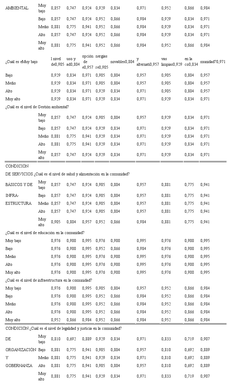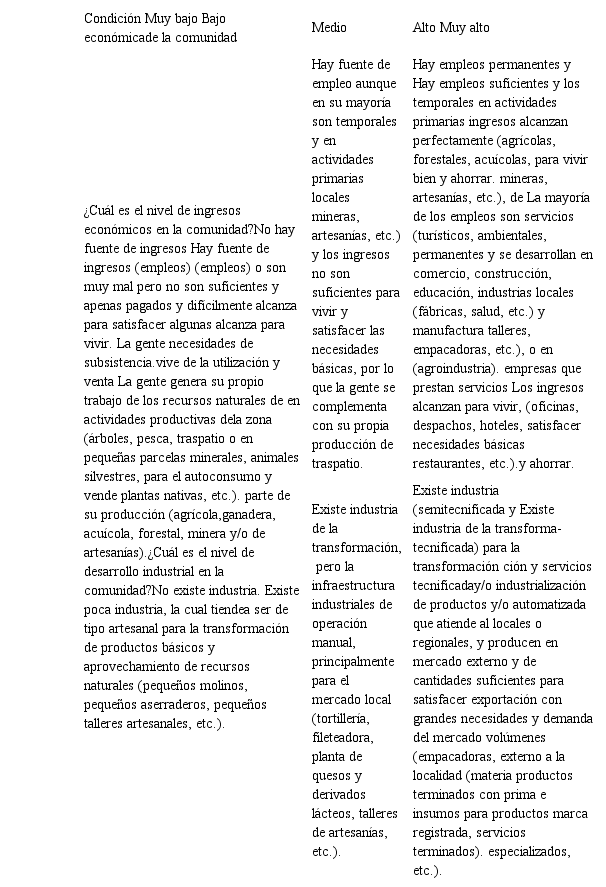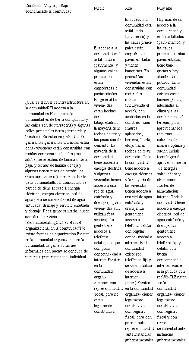Diversos instrumentos evalúan la pérdida de biodiversidad, deforestación, desigualdad socioeconómica, desnutrición, acceso a la educación, salud, seguridad, infraestructura, vivienda, servicios, democracia y paz social (Araya y Gallardo, 2015; Mora-Tivera y Cerón-Monroy, 2015; Bermúdez et al., 2017; Marcelino-Aranda et al., 2017); así como la adopción de nuevas tecnologías, uso de energías renovables, generación de bienes de consumo y bienestar (Sepúlveda et al., 2005), y la evaluación de la aptitud territorial como factor clave para el desarrollo sostenible (Fuenzalida et al., 2013; Varisco, 2016); sin embargo, siguen dispersas las diversas dimensiones del nivel de desarrollo de una comunidad rural. A este respecto, diversas contribuciones han indicado que las dimensiones que integran este constructo son el desarrollo de la niñez, la calidad de vida de las personas, la seguridad territorial, la educación, la tecnología y el empleo, estas en función de los factores de disponibilidad de recursos, fiabilidad social, justicia social, oportunidades de elección, habilidades de selección y las percepciones de satisfacción y de desarrollo económico sostenible; sin embargo estas propuestas no integran los aspectos o dimensiones fundamentales (condición económica, sociocultural, ambiental, de servicios básicos e infraestructura, y de organización y gobernanza), las cuales son consideradas como esenciales para evaluar el nivel de desarrollo en el medio rural (Salas-Razo y Juárez-Hernández, 2018).