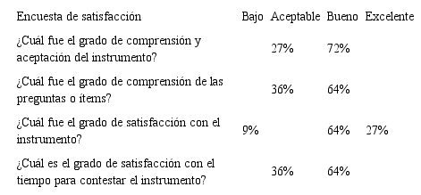 El análisis del cuestionario de satisfacción arrojó en lo general una opinión favorable respecto a la comprensión y aceptación de las instrucciones, ítems y tiempo para su resolución (tabla 6). Respecto al análisis de confiabilidad, este reveló un valor satisfactorio (alfa de Cronbach: 0,875).