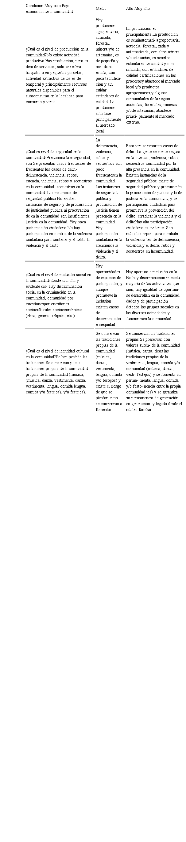 Se construyó la rúbrica analítica para el diagnóstico integral del nivel de desarrollo de una comunidad rural en sus dimensiones: condición económica, sociocultural, ambiental, de servicios básicos e infraestructura, y de organización y gobernanza (anexo 1).