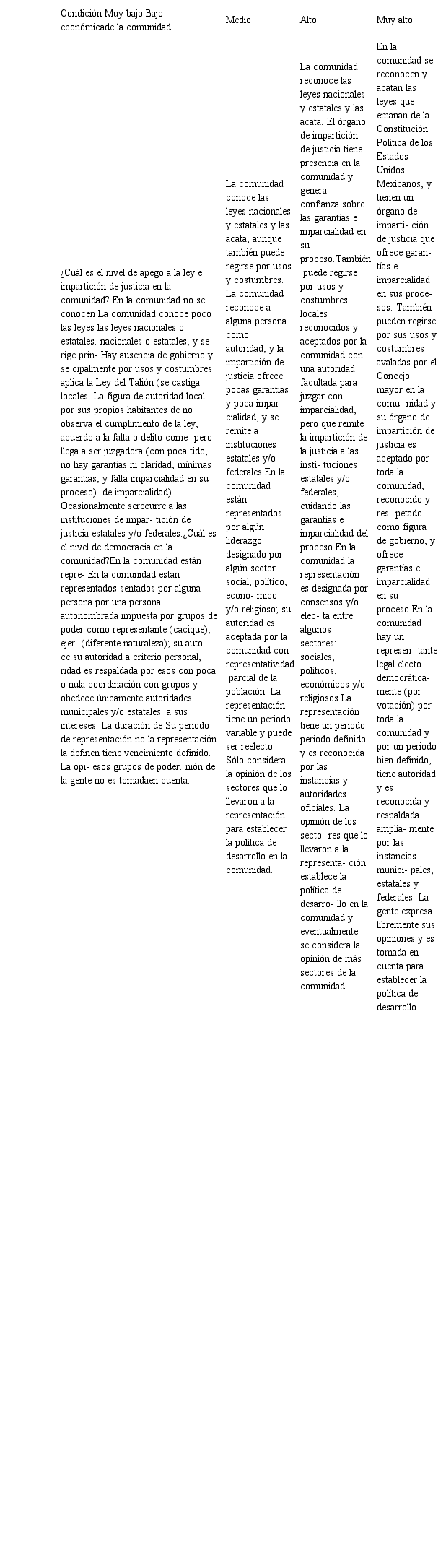 Bajo el sustento de la propuesta de desarrollo rural de Salas-Razo y Juárez- Hernández (2018), se diseñó el instrumento para evaluar el nivel de desarrollo de una comunidad rural de manera integral desde la perspectiva de sus propios habitantes. Su construcción integró las dimensiones de condición económica, sociocultural, ambiental, de servicios básicos e infraestructura, y de organización y gobernanza. Para su diseño se analizaron diferentes tipos de instrumentos y se eligió la rúbrica analítica por el nivel de especificidad que en ella está implícita y que desglosa una actividad o dimisión en diversos indicadores que describen los criterios observables para cada nivel (Mertler, 2001). Su especificidad permite efectuar un análisis detallado de cada una de las categorías o dimensiones (Mertler, 2001; Gatica-Lara y Uribarren-Berrueta, 2013)