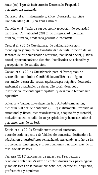 Los aportes instrumentales para evaluar el nivel de desarrollo de una comunidad rural son escasos o nulos (tabla 1). Entre los instrumentos que abordan alguna dimensión destaca el cuestionario de bienestar autorreportado (BIAIRE), el cual es un instrumento diseñado para obtener indicadores de la propia población y a la vez evaluar la dimensión sociodemográfica desde la percepción del individuo sobre su condición en el entorno (Vera et al. 2016). Aunque el BIARE representa una evaluación subjetiva, refleja en general el grado de la calidad de vida de la gente, ya que el bienestar como variable dependiente permite ubicar los factores que inciden en ella, como lo son: educación, clase social, política pública, nivel de democracia y gobernanza (Temkin y Flores-Ivich, 2017). Esto sustenta la importancia del autorreporte en el diagnóstico, planeación y diseño de políticas de desarrollo en el medio rural. Si bien los aportes reportados son escasos un aspecto fundamental son el análisis de sus propiedades psicométricas, mediante el cual se puede considerar un instrumento como científico (Kerlinger y Lee, 2002; FIDA, 2015), pues brinda evidencias válidas y confiables de sus resultados (tabla 1).
