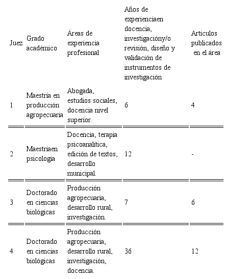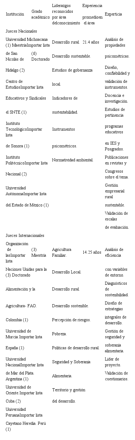 Se realizó un juicio de expertos al instrumento “Rúbrica analítica para el diagnóstico integral del nivel de desarrollo de una comunidad rural”. Este proceso es referido como la vía de mayor uso para determinar la validez de contenido (Ruiz, 2002; Escobar y Cuervo, 2008). Para la selección de expertos, se consideró el grado académico (mínimo de maestría), liderazgo reconocido en áreas del conocimiento afines a la investigación, años de experiencia en el área, experticia y publicación de artículos documentales y empíricos, diseño y validación de instrumentos de investigación (Juárez-Hernández et al., 2017; Juárez-Hernández y Tobón, 2018). Con base a estos criterios se seleccionaron 13 jueces de 6 países, incluyendo México (tabla 3). La evaluación del instrumento tuvo un enfoque cuali-cuantitativo para los criterios de claridad, relevancia y coherencia de ítems y descriptores de los niveles de desempeño. En la evaluación cualitativa los jueces podían efectuar sugerencia en extenso, así como proponer la eliminación de ítems, y para la evaluación cuantitativa los expertos evaluaron mediante una escala Likert (valor de uno a cuatro, más bajo y más alto respectivamente) los criterios descritos. Finalmente, el análisis de la evaluación cuantitativa se realizó mediante el cálculo del coeficiente de validez de contenido V de Aiken (Penfield y Giacobbi, 2004) con significancia estadística e intervalos de confianza al 90 por ciento (Bulger y Housner, 2007), considerando a un ítem/descriptor como valido cuando el valor de la V de Aiken fue superior a 0,75 (Bulger y Housner, 2007; Merino y Livia, 2009) y con un límite inferior del intervalo de confianza no menor de 0,50 (Cicchetti, 1994). Descriptores o ítems con una V menor a 0,75, o bien en el intervalo de confianza inferior a 0,50, fueron sujetos a una revisión a detalle, considerándose su eliminación o bien su mejora de acuerdo con las recomendaciones de los expertos. Se destaca que la evaluación de los expertos se sustentó en el anonimato, la iteración de estos, la retroalimentación controlada, y la heterogeneidad, aportando riqueza al análisis de una realidad tan compleja. Esto se logró con el uso de la técnica Delphi recomendada por Martínez-Carrasco et al. (2014) garantizando la opinión fidedigna de expertos.