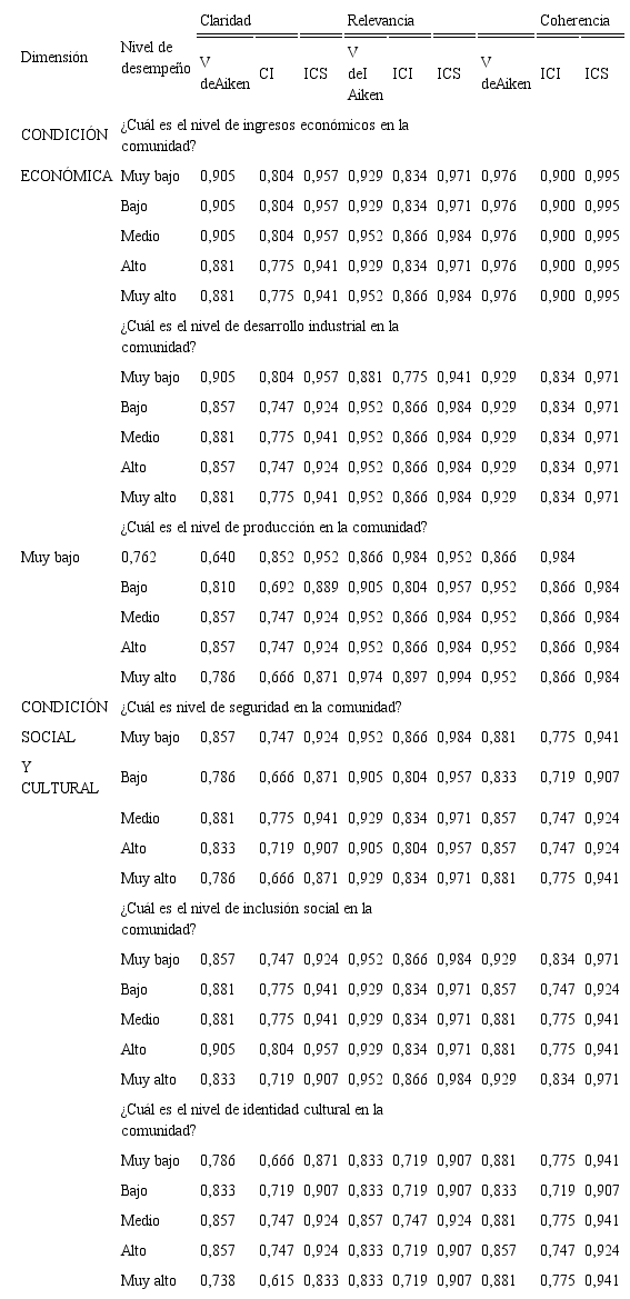 En el análisis cualitativo, los jueces expertos señalaron mejoras en el instrumento relacionadas con la extensión de algunos ítems, así como la mejora en redacción. Respecto a la evaluación cuantitativa se destaca que el 99 por ciento de ítems y descriptores de los niveles de desempeño fueron validados en términos de claridad, relevancia y coherencia (V>0,75; ICI>0,50) (tabla 5). Únicamente en términos de claridad el descriptor del nivel de desempeño muy alto del ítem nivel de identidad cultural en la comunidad no fue validado (V<0,75). Este descriptor fue analizado y mejorado en su redacción, tomando en consideración las observaciones realizadas por los expertos.