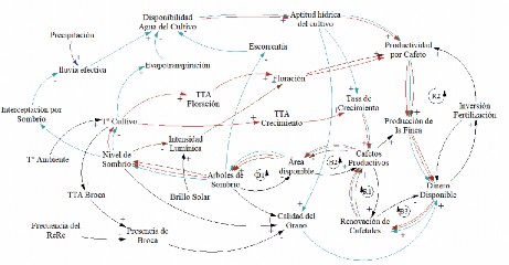 Los diagramas de ciclos causales se han usado en varios estudios referentes a la caficultura con el propósito de aportar una visión sistémica en distintas problemáticas. Bosch, Nguyen y Nguyen (2016) realizaron un diagrama de ciclos para comprender la dinámica en la cadena de suministro del café vietnamita y proponer estrategias para mejorar su competitividad. Otros autores centraron sus esfuerzos en dinámicas referentes a decisiones de inversión de los caficultores y mercadeo (Abaunza, 2011; Abaunza y Arango, 2009; Perez, 2010). Por su parte, Céspedes, Arboleda y Morales (2010) construyeron un diagrama de ciclos causales y un modelo de niveles y flujos para explorar la situación de seguridad alimentaria en pequeñas fincas cafeteras. Sin embargo, no se cuenta con estudios que propongan un modelo de dinámica de sistemas que reconozca los vínculos complejos entre aspectos climáticos, agronómicos, económicos y culturales a fin de comprender el desempeño productivo del sistema.