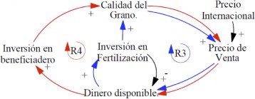El ciclo de refuerzo R2 describe una realimentación que afecta la productividad de los cafetos vía fertilización. Lograr altos niveles de productividad favorece los ingresos por venta del café cosechado. Al mejorar la capacidad económica del agricultor, es posible invertir en labores de fertilización del cultivo, cuyos resultados afectan positivamente la productividad del siguiente ciclo de cosecha.