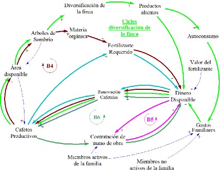 Los ciclos de balance B1 y B2 (Diagrama 1) definen la competencia por área entre cafetos y árboles de sombrío. La variable área disponible regula el establecimiento ya sea de cafetales o de sombrío. La consideración de los ciclos B1 y B2 es importante en la comprensión del nivel de intensificación de la finca (libre exposición – cafetal con sombrío), ya que el nivel de sombrío que el caficultor mantiene en su sistema afecta aspectos como la densidad de siembra, la cantidad de fertilizantes a usar, la productividad por cafeto, la calidad del café y la mano de obra necesaria para las labores del cultivo.