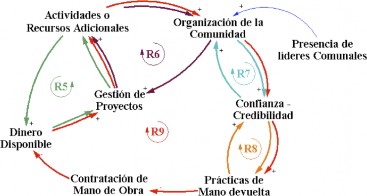 En el diagrama se observa que los cinco bucles de realimentación tienen una característica de refuerzo. La dinámica de ese ciclo puede entenderse como un círculo virtuoso donde las acciones de la comunidad permiten su propio progreso, o por el contrario, como un círculo vicioso donde las relaciones conflictivas entre las personas no les permiten organizarse ni crear vínculos de confianza. Se puede decir que las retroalimentaciones identificadas en el diagrama de ciclos causales del capital social siguen la lógica que expresa Lugo-Morin (Lugo-Morin, 2013) el cual manifiesta que existe un bucle entre “… la acción y las relaciones existentes, dado que la acción puede consistir en crear una relación, modificando con ello la red, que a continuación tendrá una influencia en la acción, y así sucesivamente…”.