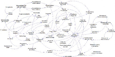 El propósito inicial de los recorridos y entrevistas en campo fue el de comenzar la identificación de las interacciones y componentes que estructuran el agroecosistema. Esto aunado al soporte con literatura científica y comentarios de expertos permitió el diseño de las primeras versiones del diagrama de ciclos causales.