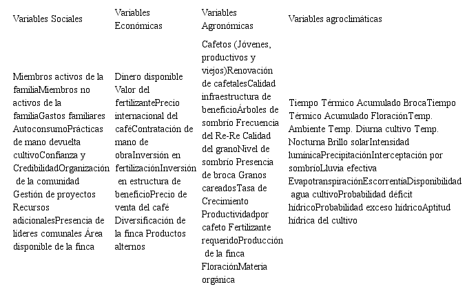 En la medida que avanzaba la investigación se fueron identificando las variables a tener en cuenta en el estudio. La Tabla 1 muestra las variables usadas en el diseño final del diagrama de ciclos causales, en ella estas se clasifican en categorías de tipo social, económico, agronómico y agroclimático, para favorecer la visualización. En el diagrama de ciclos causales (Anexo 1) se observa como esas variables interactúan unas con otras debido a las relaciones de causalidad y ciclos de realimentación encontrados.