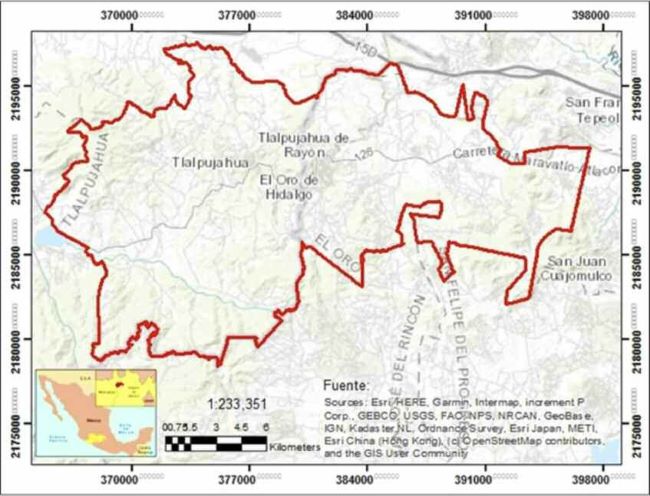 The study area corresponds to the Tlalpujahua-El Oro Mining District (DIMITO, in Spanish) located in central Mexico, about 100 km northwest of Mexico City and covers an area of 329 km². The DIMITO is located on the Mexican Volcanic Belt, which crosses the Mexican territory from west to east at 19º north latitude. The relief is basically mountainous with altitudes ranging between 2,500 and 3,200 meters above sea level. It is a territory with high geodiversity, biodiversity and cultural wealth, associated with the historical use of occupation; between the 18th and 20th centuries it was a world-class mining area. The mining activity, economic sustenance of the District, stopped six decades ago. Currently, the tourist activity based on its mining past constitutes the main base of the economy of the region.