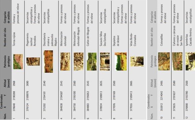 Este instrumento es determinante para la toma de decisiones en la gestión del geoturismo, ya que a partir de él se diseñan y ejecutan las estrategias de conservación, interpretación, promoción y monitoreo de los sitios (Brilha, 2016), que son el insumo principal de la actividad geoturística. Como parte del marco metodológico y para ilustrar la riqueza y diversidad geológica y geomorfológica del territorio, así como para jerarquizar los sitios de acuerdo con las necesidades de protección y conservación, se presentan los doce sitios que integran el catálogo (Tabla 1).