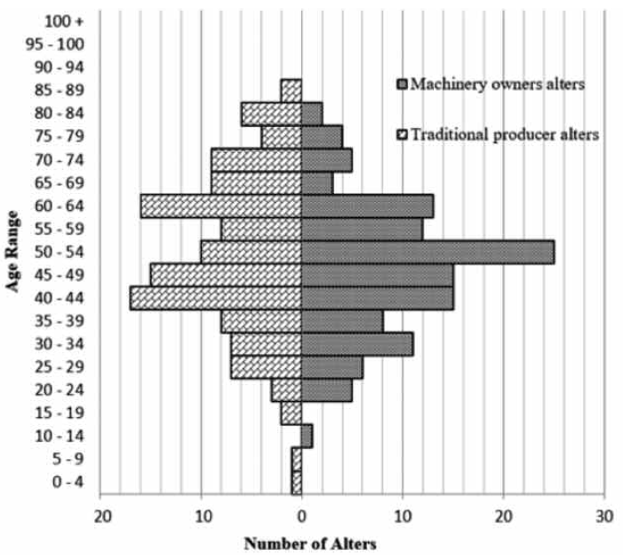 The ego-centred networks shows some interesting characteristics in relation to alters’ (network members) attributes. In relation to age, which is an important factor concerning production and labour, machinery owners’ alters have a slightly lower age average (48.18 years) in comparison with traditional producers (50.36 years). However, looking at the age pyramid visualization in Figure 2 it is possible to notice how the machinery owners alters are mainly situated in the middle age range section, especially in the 50-54 years. On the other hand, in the traditional producers’ side, the upper age range section stands out with a stronger representation, especially from 60 to 90 years. This could imply a larger amount of alters in a work/productive age for the machinery owners, while a larger amount of retired people in the traditional producers’ networks.