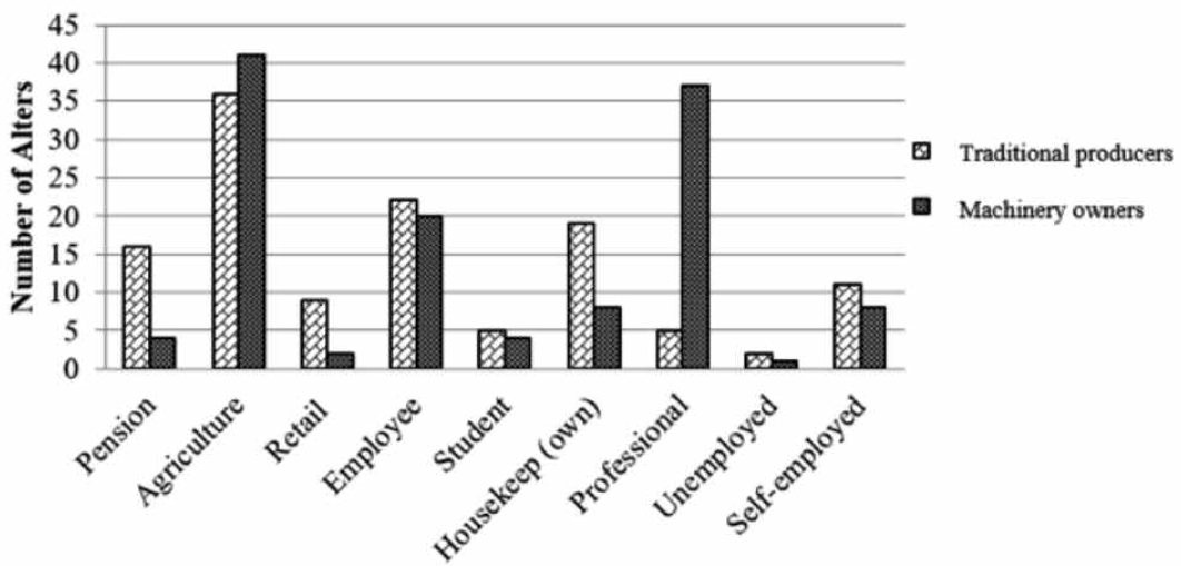 Another relevant factor for agriculture labour exchange dynamics is the network members’ occupation. Almost 31 % of all alters have agriculture as their main economic activity, with a minimal dominance for the machinery owners alters’. Along with this, the main gap between the two groups can be found in the number of professionals (with a college degree) in the network, having machinery owners surpassing for more than seven times the traditional producers’ networks. This former groups also leads on alters with retirement pensions as main income which correlates with the age results shown in Figure 2. Network member occupation breakdown can be visualized in Figure 3: