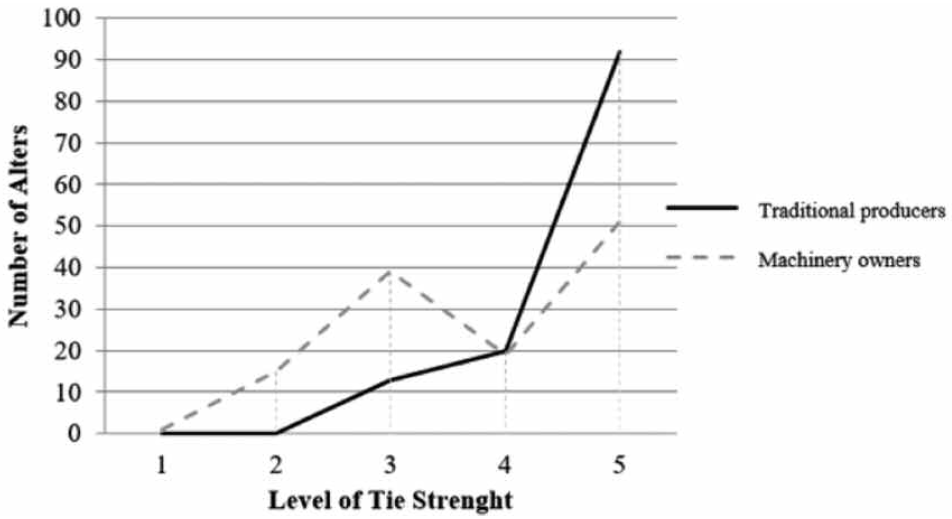 Finally, in terms of network attributes, one of the key elements in any network, especially in the context of cooperation, is the tie strength between the respondent (ego) and alters. Here, for each alter added the respondents were asked to grade “How close they feel to each person in their network”. For this, a scale from 1 to 5 was used, where a 5 score meant a “Very close” relationship (kinship is included in this score) to “Not close at all” for a 1 score. The resulting graph (Figure 5) illustrates how traditional producers’ networks presented a much higher number with high tie strength compared to machinery owners. This is especially notable for ties with score 5 (Very close relationship) almost doubling the numbers of alters in machinery owners’ networks.
