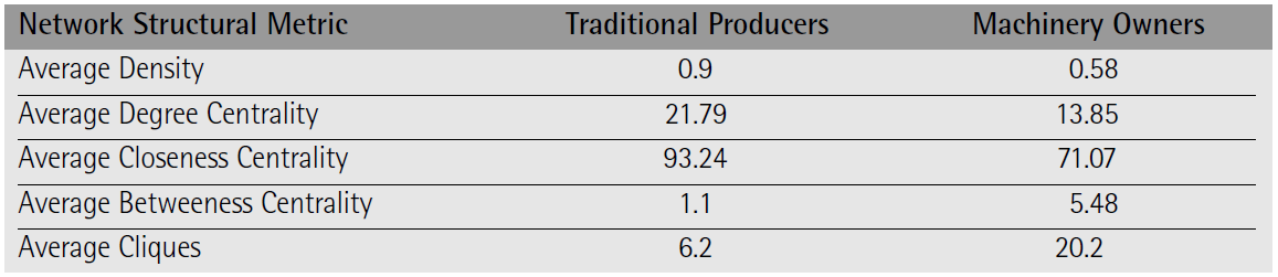For all these metrics, results show higher values for traditional producers’ networks, and therefore, presenting them as much more connected than machinery owners’ networks. The average betweenness centrality results are consistent with this, where a lower value means that there are less nodes acting as needed bridges between other nodes due to high amount of connections within the network.