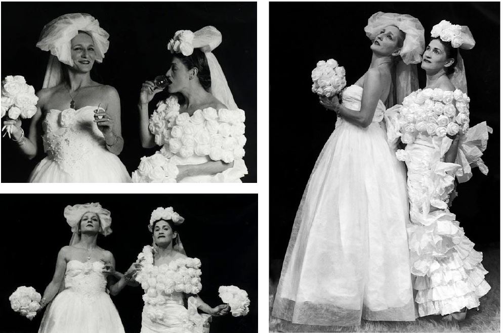 Pero yo quería aclarar que… También nos divorciamos. El 14 de febrero. De repente abrimos el periódico, y leemos que Marta Sahún, la vocera de la presidencia, que estaba casada con un señor y tenía 3 hijos va al Vaticano y logra anulación de su matrimonio. Cosa que… […] ¡Entonces yo le dije, Jesu, si esto ocurrió entonces yo me caso! Porque no veo cuál es la ley ni cuáles son las razones. […] Y el problema grande fue encontrar trajes de novias para nosotras, ¡porque ven mi tamaño! ¡Todo lo que me ponía me amorataba los brazos, así, o los vestidos que te rentan son de chavas de 16, 18 años, yo tengo 46! ¡Y ya embarnecida y todo aquello! [Y Jesusa agrega] Y dar ese mal paso a nuestra edad… [Liliana continúa] Y un amigo genial nos hizo los vestidos de papel. Entonces nos disimuló todas las…
