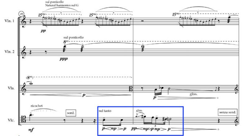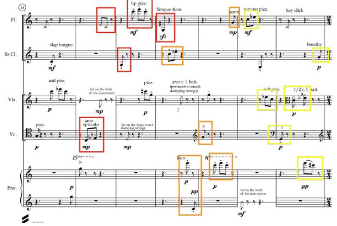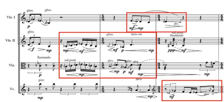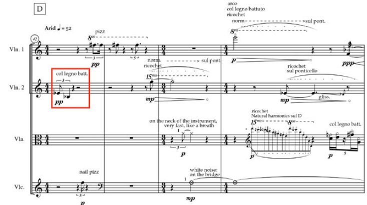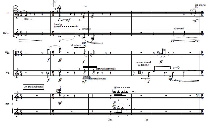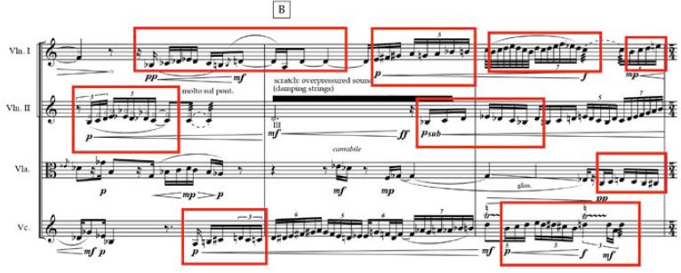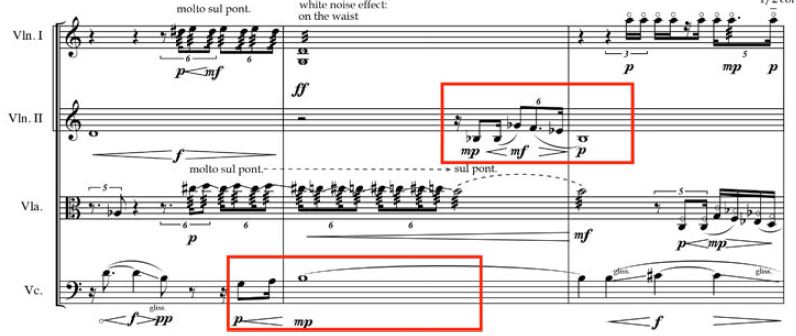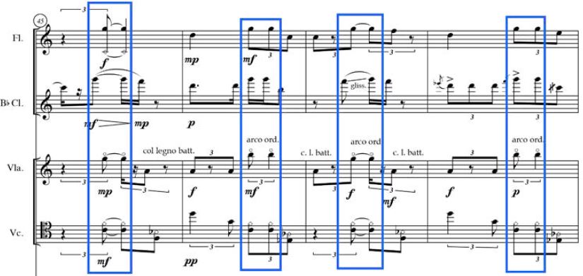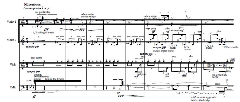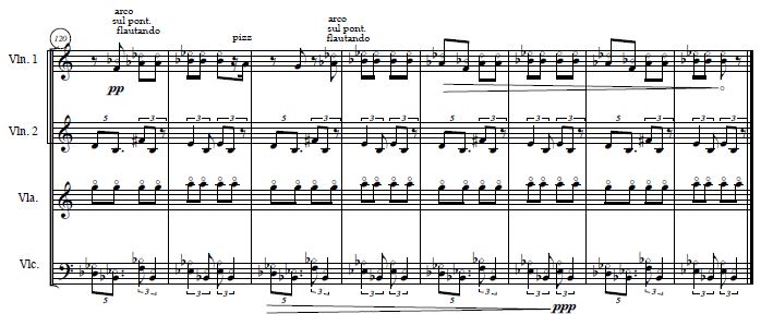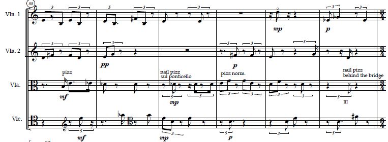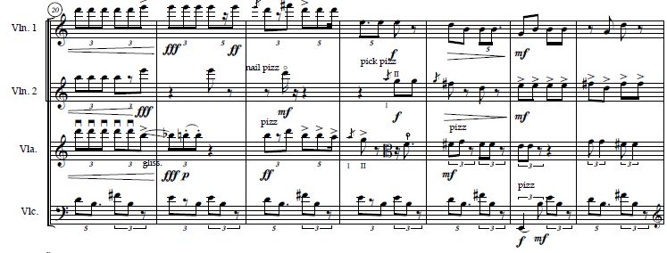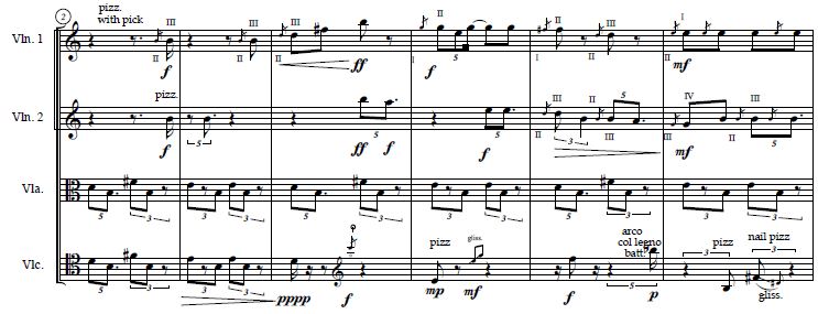 Además, se crea una poliritmia general mediante el uso de unidades extramétricas. como tresillos y quintillos, y de un gran número de acciaccaturas. Sumado a esto, el medio percutivo general es representado por el uso de distintos tipos de pizzicato en las cuerdas (como pizzi- cato Bártok, pizzicato de uña (nail pizz.), pizzicato sul ponticello, pizz. detrás del puente (behind the bridge), normal pizz. . pizzicato con la mano izquierda (left hand pizz.), arcos con el lado de madera (col legno battuto) y el llamado a tocar en el cuerpo del instrumento, como se puede ver en los ejemplos mencionados.