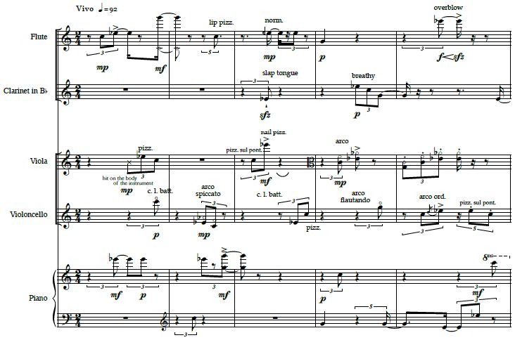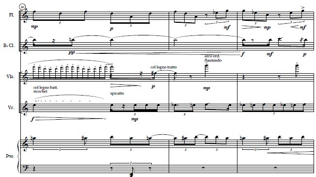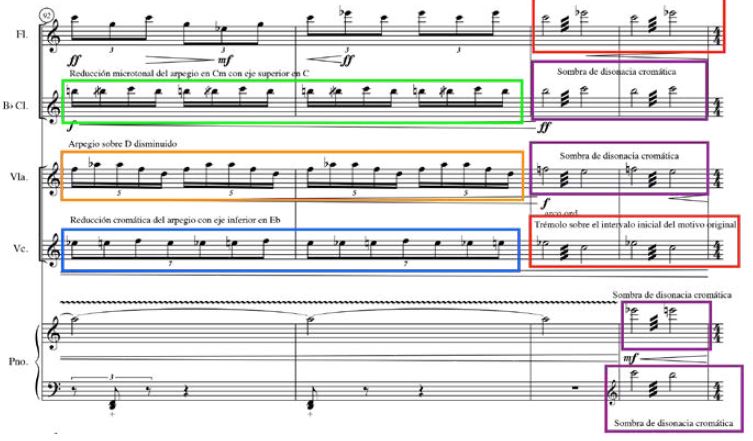 En la figura 2, podemos observar cómo la flauta lleva la línea principal tomada de la pri- mera transcripción. En ella los acentos presentes en la grabación citada se hacen explícitos mediante indicaciones de dinámica, articulación y precisiones agógicas. Se hace también una indicación aproximada de lo que se infiere pueden ser las inflexiones de entonación que se perciben en la fuente original. Esto explica el uso de microtonos. Puede verse también que el violonchelo está en unísono con la flauta, en una intensidad más baja por el modo de producción del sonido (armónicos artificiales) y la dinámica que se indica, y en posición de segunda menor en algunos ataques para contribuir con la inestabilidad que se está buscando representar. De la misma manera, encontramos que el clarinete hace un “unísono equívoco” con la flauta, al superponer subdivisiones del pulso binarias sobre ternarias y al reemplazar el diseño arpegiado de do menor que sugiere el tema original por una conducción por grados conjuntos. Igualmente, se puede observar que la mano derecha del piano y la línea de la viola hacen contramelodías o variaciones de fragmentos de la melodía principal en distintos lugares métricos, lo cual añade cierto caos a la textura. La mano izquierda del piano tiene una imitación de los ataques de lo que hace la percusión en la fuente original.