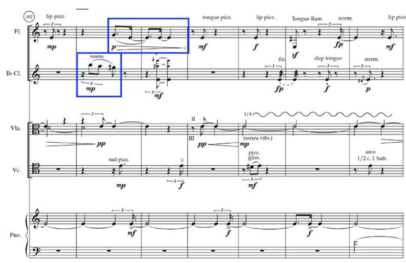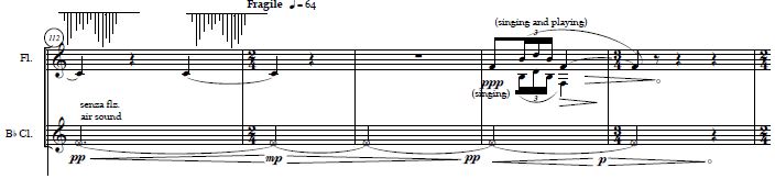 Hasta este punto hemos visto procesos de saturación por la repetición excesiva de una célula melódica. En contraste con estas construcciones podemos encontrar otros casos de difuminación —o desterritorialización— de la melodía. El siguiente ejemplo nos ilustra esta situación en el fragmento que tiene la flauta en el compás 115 (figura 8). Ahí se puede ver que el instrumentista debe tocar la línea superior y cantar la inferior para lograr cierta distorsión en el timbre. Esto está acompañado por un sonido de aire en el clarinete que contribuye al ensombrecimiento que se busca.
