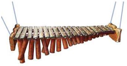 Una de las particularidades de la marimba de chonta (figura 14) es que sus teclas están cortadas de tal forma que la percepción de su timbre resulta como “rajado”. De alguna forma, el momento inicial del ataque de los sonidos encierra una suerte de multiplicidad que no ocurre en el timbre homogéneo de la marimba sinfónica. Con respecto al sistema temperado de alturas, la entonación de la marimba de chonta resulta imprecisa e inestable. De hecho, según Carlos Miñana (1990), la afinación de estos instrumentos evidencia una marcada tendencia hacia una escala isoheptatónica, es decir, la que divide la octava en siete sonidos separados por intervalos iguales de 170 cents.7 Además, con relación a la manera en que este instrumento usualmente se toca, las articulaciones tienden a parecer como con cierto rebote, un tanto indefinidas.