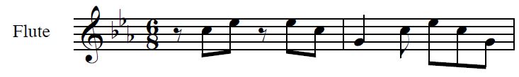 La estructura del primer movimiento de Fiestas de Pubenza se caracteriza por una trans- cripción inicial del tema El sapiroco, bastante cercana a la grabación que se menciona, pero con especial cuidado en no incurrir en una abstracción del tema que excluya las idiosincrasias interpretativas de este. Con el fin de ilustrar esta situación, se muestra de qué manera podría incurrirse en ella en la figura 1, donde se hace uso de una transcripción que atienda, princi- palmente, a las inflexiones melódicas y al lugar métrico de los ataques, eliminando tanto las redes contrapuntísticas que se derivan de la participación de varios flautistas que hacen me- lodías y contramelodías como la línea de la percusión. Esto daría lugar a una melodía en 6/8 que contiene las notas estructurales del tema de El sapiroco. La forma de la pieza se mantiene parcialmente y, en cada una de las reiteraciones de las distintas frases de cada sección, hay un interés especial en exagerar algunos fenómenos tímbricos que hacen evidente la hetero- fonía de la textura, la cual se manifiesta de distintas maneras. Por un lado, se puede ver la elaboración de una textura polirrítmica que exhibe los distintos puntos métricos de ataque de los varios miembros de la chirimía en un tejido sonoro que contiene distintas subdivisiones del pulso. Por el otro, hay un intento por representar las distancias posibles que puede haber entre los músicos al ejecutar la pieza y las cualidades diferentes de los instrumentos con que están tocando y los distintos niveles o estilos interpretativos que se pueden encontrar entre un músico y otro, con asignaciones tímbricas particulares para cada línea. En este sentido, la idea del ensamble Pierrot ofrece la posibilidad de que cada instrumento del quinteto sea un tipo de flauta diferente. Incluso la flauta será llamada a tocar de distintas maneras, con el fin de encarnar la multiplicidad descrita. A medida que se resaltan las particularidades mencio- nadas, la obra empieza a dirigirse hacia lugares de mayor distorsión que hacen que haya una transformación considerable hacia el final del primer movimiento, punto en el cual ya no se hace reconocible el contorno melódico del tema El sapiroco. Como si su melodía se hubiera ya olvidado tras varios intentos vanos de recuperarla, de recordarla, mediante la repetición. Esto se puede observar en varios ejemplos que se citan y describen a continuación.