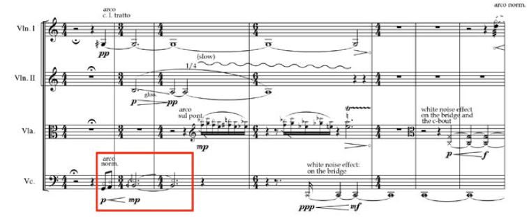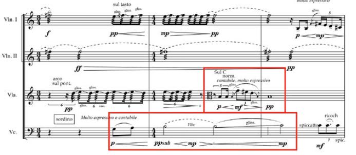 Con relación a la definición tímbrica de los ataques y las articulaciones características que se están tomando de la fuente original, en este mismo ejemplo (figura 15) se pueden encontrar acciacaturas en unísono (en cuerdas distintas para facilitar su ejecución). También podemos ver que el violín 1 es llamado a tocar el pizzicato con un pick (o plectro), mientras que el violín 2 hace un pizzicato normal. En el violonchelo, encontramos el uso de arco col legno en el compás 6 y pizzicato con la uña en el 7.