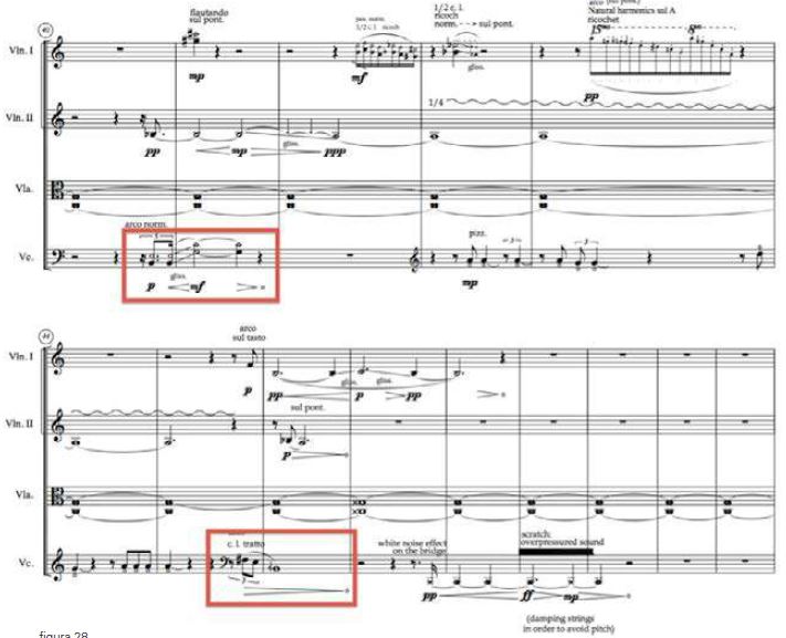Después de llegar a este lugar de gran densidad textural que constituye el punto de arti- culación entre las dos partes del movimiento, el desarrollo subsiguiente ocurre en una defini- ción sonora débil, oculta, ausente, olvidada, como si la fuente sonora emitente se encontrara no solo lejos de su receptor, sino obstruida por una bruma ruidosa que estuviese haciendo incomprensible el tejido sonoro. Con esta sonoridad transcurre la segunda mitad de este mo- vimiento. En él aparecen fragmentos del tema Junto al mar en distintas presentaciones, todas borrosas y abstractas (figuras 27 y 28).