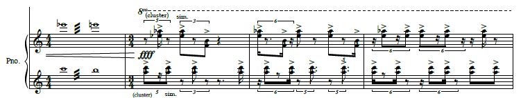 En la figura 6, encontramos lo que surge de la ruptura de los elementos que dieron forma y definición a la melodía de El sapiroco. Se trata, nuevamente, del tema, pero bajo un halo de abstracción diferente de la ondulación perpetua que se vio en el ejemplo anterior y que cons- tituye la primera gran detonación del tema. Este aparece en tal lugar en forma de un contorno que se define como un punto medio que oscila entre uno más agudo y otro más grave que alude al diseño del tema original en el cual se da una alternancia desde C entre las notas Eb y G que completan el arpegio en segunda inversión de la tríada en do menor. En este caso, las notas son reemplazadas por regiones de clusters en tres áreas diferentes del registro agudo del piano. La prosodia de la línea original pasa de mostrar subdivisiones ternarias del pulso a tener distintas subdivisiones en cada uno. En el segundo compás del ejemplo, de hecho, pue-de verse cómo el primer pulso tiene una subdivisión de quintillos, el segundo de tresillos y el tercero de semicorcheas. Con esto se busca acentuar la inestabilidad del frenesí alcanzado por la acumulación de tensión que el desarrollo de la obra construye hasta ese momento.