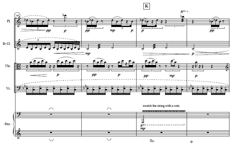 Lo anterior desemboca en un punto climático en el que el tempo se incrementa de manera considerable y el tema sufre un proceso de abstracción para pasar a convertirse en un simple trémolo. En el caso de la flauta y el violonchelo, el batimiento se da en un intervalo de tercera menor entre C y Eb; y en el caso del clarinete, la viola y el piano, en uno de segunda menor que añade una sombra de disonancia a cada una de las dos notas del trémolo principal (figura 5).
