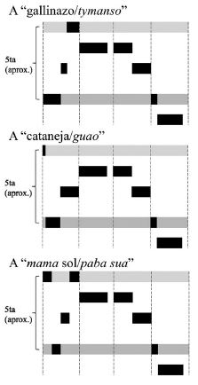 De este modo, cantos como los de gallinazo/tymanso, cataneja/guao y mama sol/paba sua comparten secciones musicales que sugieren coherencias con las relaciones cosmogónicas y míticas que tienen estas aves con el sol, además de expresar la relación de los tres con el guatquyca o mundo de arriba, en la concepción espacial muisca (Legast 1998, 95). A su vez, cantos como los de zorro/fo, oso/guia, tigre/comba y madre tierra/hicha guaia permiten apreciar, desde el uso de recursos musicales similares, la manera en que se relacionan los mamíferos terres- tres con la madre tierra y el mundo terrenal (quyca).
