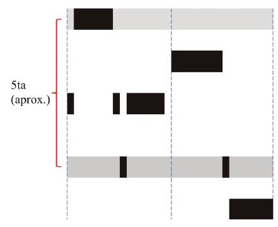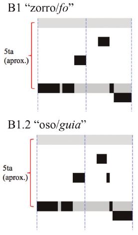 Como vemos, la lógica formal de este canto expresa una sucesión de módulos o motivos bastante larga y compleja que se caracteriza por un reemplazamiento progresivo de las secciones que da lugar a nuevos motivos melódicos (figura 11). Esta lógica de sucesión resulta bastante particular dentro del repertorio estudiado, razón que nos lleva a pensarla como un aspecto característico y único del canto de oso/guia. A su vez, es posible interpretar esta lógica formal desde algunas dinámicas propias del mundo natural referenciado, en este caso el comportamiento etológico específico del oso de anteojos.