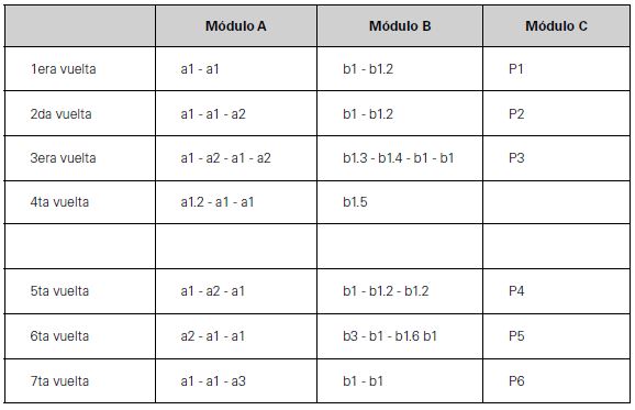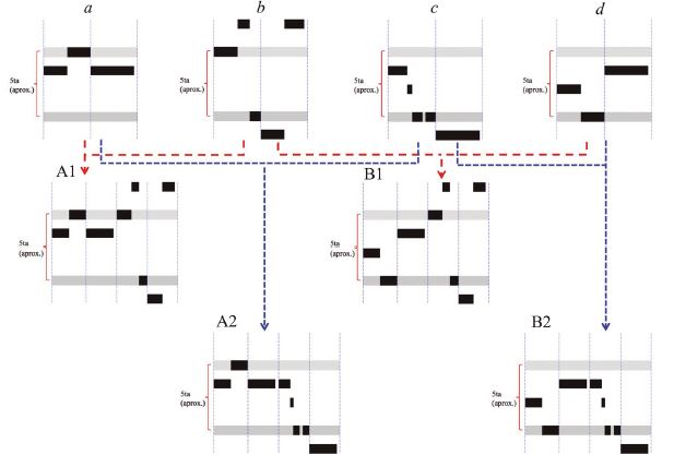 La forma en que se constituye este canto tiene un rasgo bastante particular, que es la compo- sición de todo el canto desde cuatro micromódulos o gestos melódicos pequeños (a, b, c y d), que, al combinarse de a pares, conforman dos grupos de módulos (A y B) estructuradores del canto (figura 12). Dentro de los cuatro micromódulos mencionados, dos (a y d) funcionan como inicio de las frases, mientras los otros dos (b y c) las concluyen. De este modo, los módulos A y B se diferencian en el micromódulo que utilizan para iniciar (a en A y d en B). Esta dinámica formal del canto de culebra/muyso, que se diferencia de los demás ejemplos, es un recurso que resaltaría una posible sensación de continuidad en él.