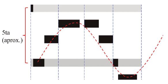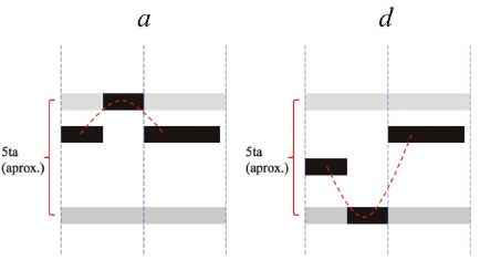 Por otro lado, la semejanza rítmica entre los micromódulos que funcionan como inicio de las frases reforzaría esta sensación de continuidad. Estos segmentos (a y d) contienen el mismo gesto rítmico (figura 13). Al comparar esta frase con la estructura rítmica de los micromódulos c y algunas variantes del b, podemos ver una constante aceleración en la primera parte de la frase, que es frenada en la mitad y produce una pausa al movimiento rítmico que solo es retomada en los siguientes segmentos. Esta dinámica constante de movimiento-pausa que se contempla a lo largo del canto de culebra/muysopuede interpretarse de forma correlacionada con algunos aspectos del movimiento del ofidio, similarmente a lo sucedido en los cantos anteriores.