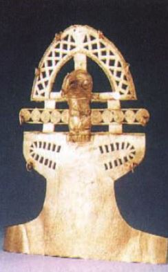 Aspectos como el tamaño y el color negro de las aves descritas, así como la frecuente aparición de catártidos en la orfebrería muisca, nos remiten a pensar, en sintonía con Legast (1998), en estas “aves negras” como especies de la familia Cathartidae (34-48), habitantes nativos bastante numerosos del altiplano cundiboyacense, en especial en el caso del gallinazo y la cataneja o guala cabecirroja. En atención a esto, la relación entre estas aves y la luz primigenia de la creación resultaría ser un aspecto fundamental del pensamiento muisca, que se resalta en la relación lingüística entre sue (ave) y sua13 (sol), si tomamos el sol como forma tangible de esta luz originaria (Gómez 2012). Podemos observar también esta conjunción entre el ave y el astro celeste en la pintura rupestre, tal y como se observa en un conocido pictograma ubicado a las afueras de Soacha (figura 2). En esta imagen, vemos la representación de un ave con las alas desplegadas y cabeza de sol con rostro antropomorfo, que recuerda las aves en vuelo predominantes en la orfebrería muisca (figura 3) (Legast 1998, 82).
