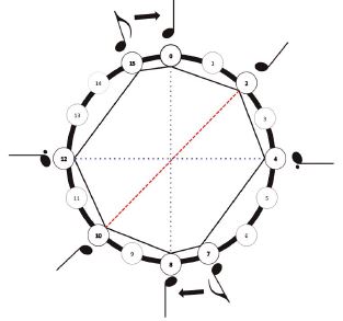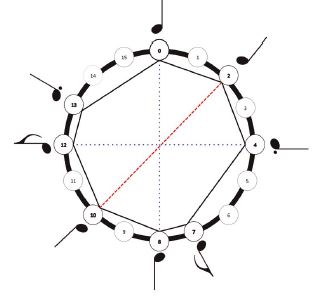 De vuelta a los aspectos musicales compartidos por estos tres cantos, está la recurrencia en elementos que podríamos describir como circulares, tanto en lo melódico como en lo rítmico. En el motivo inicial de los cantos, podemos ver cierta circularidad en su estructura melódica ascendente y descendente que se desplaza desde el sonido inicial y vuelve a un sonido más grave, por lo que genera un bucle cíclico (figura 4). Asimismo, la rítmica constante en los motivos siguientes de los cantos puede ser entendida desde el punto de vista de la circularidad y la simetría. Como vemos en la figura 5,14 la composición de la célula rítmica de los módulos B2, B3 y B6 de cataneja/guao, del B4 de gallinazo/tymanso y de B3 y B6 de mama sol/paba sua podría percibirse como circular gracias a su condición simétrica o no retrogradable. Asimismo, la célula rítmica de B2 y B3 de gallinazo/tymanso, de B1 y B5 de cataneja/ guao y de B1 de mama sol/paba sua presenta otro tipo de sensación de continuidad dada por el impulso constante hacia el inicio de la frase desde el último sonido (figura 6). En atención a la figura resultante en el interior de los círculos de ambos gráficos, es notable la similitud y simetría estructural de los ritmos. A su vez, es importante resaltar que, salvo algunas pocas excepciones, estos dos ritmos constituyen todos los motivos de los tres cantos, y generan una posible sensación de continuidad y repetición.