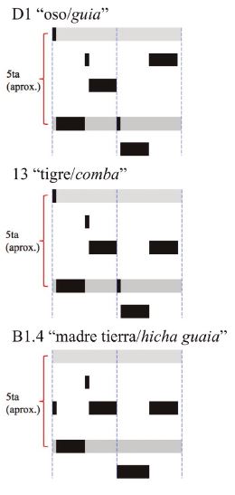 Otro ejemplo de este tipo de continuidad entre lo musical, lo cosmogónico y lo natural se puede ver en los cantos referidos a mamíferos terrestres como el zorro, el oso y los felinos, y a la noción cosmogónico-natural de la madre tierra. Si bien estos no guardan similitudes motívicas tan evidentes como en el grupo anterior, sí comparten ciertos gestos musicales que nos llevan a explorar algunas correlaciones entre lo sonoro y lo cosmogónico. A su vez, el canto de oso/guia nos muestra algunos elementos que podrían conectar lo musical con lo natural, como veremos más adelante.