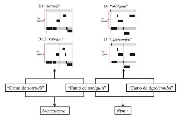 En el relato del cronista, vemos una doble representación animal de Nemcatacoa, con apariencia tanto de oso como de zorro, lo que correspondería a la similitud motívica entre sus cantos. Por otro lado, la relación motívica entre los cantos de oso/guia y tigre/comba podría ser vista desde la relación entre estos animales en algunos aspectos culturales de lo muisca, como es la ambigüedad semántica de la palabra nymy. Este vocablo, según diversas fuentes, aparece como “león”, “gato montés” e, incluso, como “oso” (Gómez 2012; Acosta 1938, 38). De este modo, su amplitud de significados nos sirve como punto de unión entre los cantos estudiados: así como el animal oso se encuentra asociado tanto a Nemcatacoa como a la palabra nymy, el canto de oso/güia se correlaciona motívicamente con el canto de zorro/fo y el de tigre/comba (figura 9).