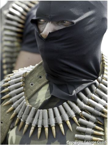 Se entiende, entonces, que este ciclo de devastación ecológica ha sido también de devastación social, y que el delta del Níger se ha convertido en un “gigante reservorio de ira y disidencia” (Caminero-Santangelo 2014, 137), donde figura un amplio espectro de fuerzas e intereses identificados con grupos sociales no violentos, movimientos políticos, milicias étnicas y milicias separatistas (que algunas veces coinciden), paramilitares y fuerzas del Estado, que evidencian las dificultades existentes para hablar de una supuesta “nación nigeriana”. Una de las milicias es la Movement for the Emancipation of the Niger Delta (MEND), creada en 2004 y hasta hoy el grupo militar rebelde más grande de todos. Reconocidos por sus máscaras negras y rifles de asalto Kalashnikov, patrullan los canos del delta en lanchas rápidas que casi vuelan sobre el agua. Osodi ha retratado un militante de una manera muy especial, mostrando la cinta de municiones que da vuelta sobre sus hombros como si fuese una suerte de collar en el que los proyectiles reemplazaron las semillas y huesos, y un rostro humano que con la máscara pareciera transformarse en el de un ave (figura 11).