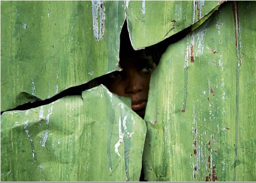 Parte del esfuerzo de Osodi por formular y responder a la doble pregunta con la que cerré la segunda parte de este artículo, se anuncia en la fotografía del joven, de este miliciano, y de una tercera con la que cierro este artículo: la de una niña o un niño que mira a través de los cortes hechos en una lata verde (figura 12). Estos cortes, producto del impacto de machetes, ha resultado en la sugerente forma de un ave en pleno vuelo. Contrastada con la inmediatamente anterior, revela una máscara que no transforma el rostro en uno de un “ave”, sino que revela la forma del ave teniendo como “contenido” su rostro.
