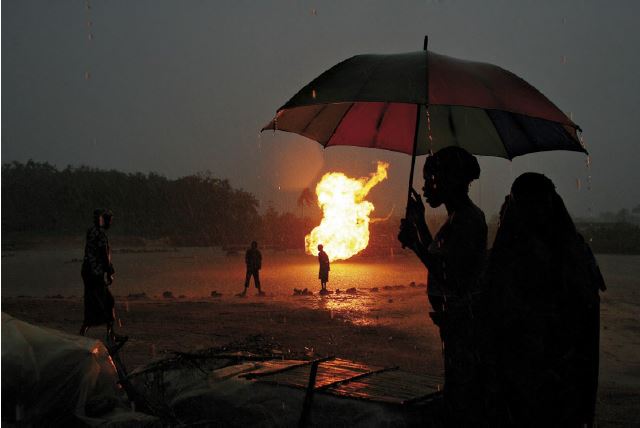En otra fotografía (figura 3) de la serie, vemos al menos cinco personas bajo la lluvia. Dos de ellas, presumiblemente mujeres, aparecen en el primer plano bajo un paraguas similar al anterior. Sobre la tierra, a la izquierda, observamos una esterilla y plásticos; y un poco más allá, otra mujer que camina bajo la lluvia en dirección contraria a la dirección de observación de la mujer que sostiene la sombrilla. Luego, en un tercer plano, vemos dos figuras (un hombre y una mujer) que, como la mujer a la derecha, parecen absortos en el fuego. La llamarada es el foco de atención fotográfico y centro virtual del accionar o silencios de estas personas. La potencia energética asociada al petróleo (que al ser extraído trae consigo gas que ha de ser quemado cuando no puede ser usado (Thurber 2019)) abre un claro en la noche y en el paisaje, define una nueva “ágora” en una región donde se respira el aire poluto de la petronación. Esta imagen nos recuerda que a veces no reparamos lo suficiente en que el fuego y el aire, y en este caso el gas consumiéndose, “antes que un ser natural es, sobre todo, un ser social” (Bachelard 1966, 22).