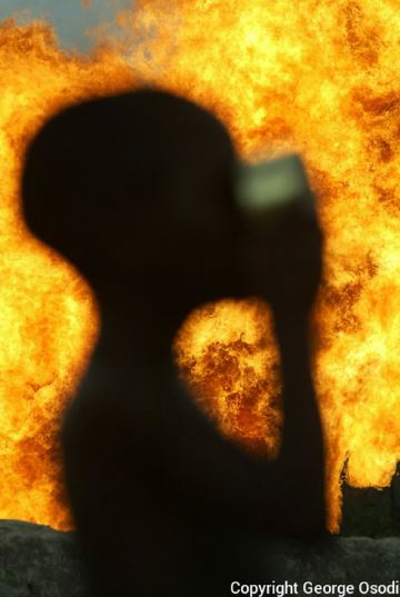 El festival evidenció que la petromodernidad de la década de 1970 en Nigeria fue un todo “espectáculo” (Wu 2016, 180). Pero este espectáculo, como lo sugiere poéticamente las siguientes dos fotografías de la serie de Osodi, continua y es el de una modernidad transformadora del paisaje y la cultura nigeriana. Se trata del espectáculo que ha involucrado la instalación de gigantes llamaradas de gas en combustión que han transformado el aire, los suenos, el espacio, el tiempo y la sociabilidad de la gentes del delta del Níger.