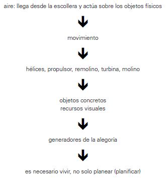 En consecuencia, en El planeador… está presente la alegoría literaria, de tema filosófico, que adquiere una dimensión visual a través de vestuario y escenografía, y que en esta dimensión podría considerarse una alegoría dinámica (hélices, aire, por tanto, movimiento). Es también una alegoría con un fin moral, al estilo de las usadas en el mundo religioso occidental: no es posible solo planear, sino que se debe vivir.