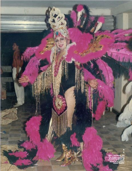 En los eventos LGBTIQ+, sobresalen el Carnaval Gay de Barranquilla y el Atlántico (CorpoGay), que se celebra desde la década de los ochenta, y el Sirenato Gay de la Cumbia de Puerto Colombia, que se realiza desde la primera década del siglo XXI. Nos acercamos a las imágenes del Carnaval Gay en las que sobresale Jairo Polo, fundador, presidente de CorpoGay y director del evento, quien aparece con sus disfraces (figura 1); todas son creaciones suyas, como lo reconoció en la entrevista. En las otras, aparecen reinas como Rosa Paulina (Lino Fernando), Mari Luchi, Julieth Pantoja (Víctor Ladrón de Guevara), entre otras (figuras 2 y 3). La procedencia de las imágenes se sabe que pertenecen al Archivo de CorpoGay y a la Julieth Pantoja. Junto a estas imágenes la voz de Jairo Polo: